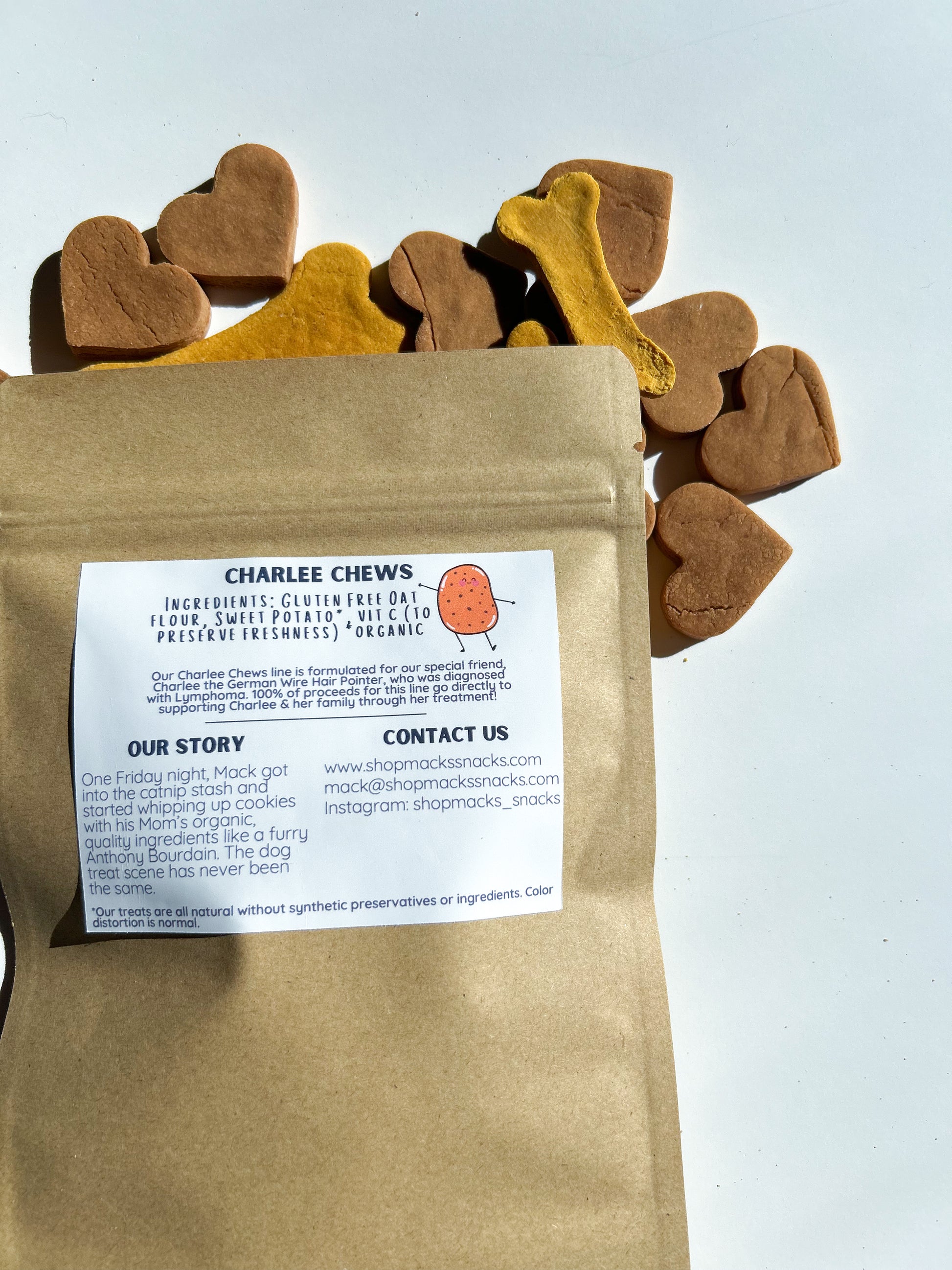 Two ingredients - Sweet Potato & Oat Flour! Formulated for our special friend, Charlee the German Wire Hair Pointer, who is going through treatment for her lymphoma right now. This treat is made with over 50%+ sweet potato.